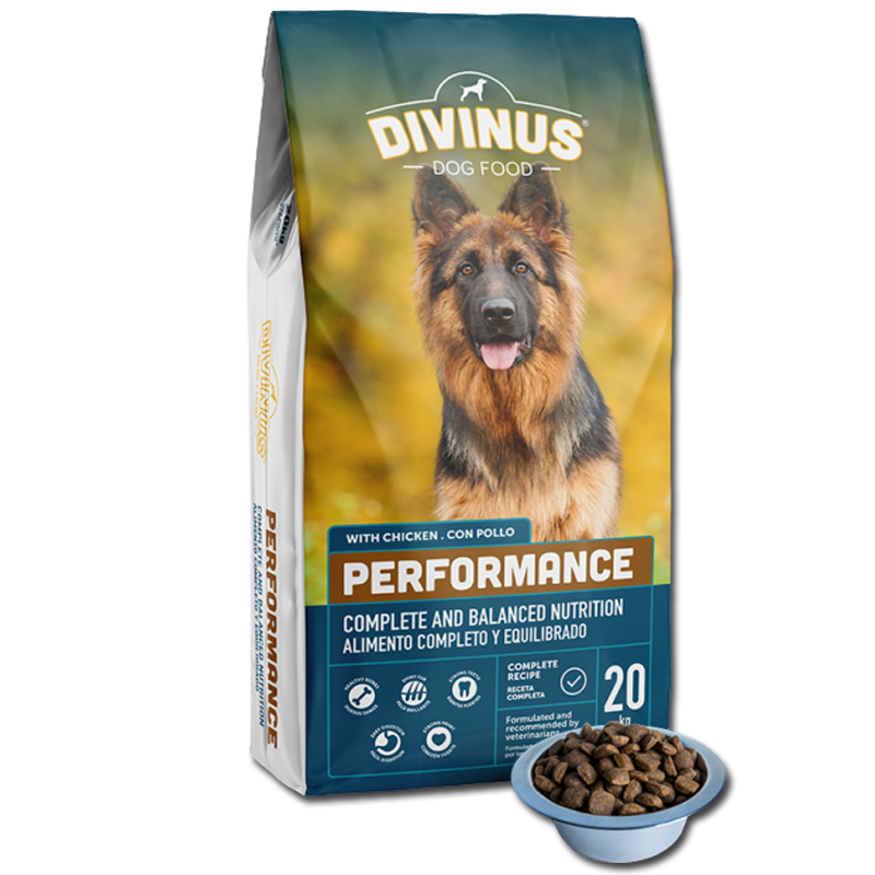 Divinus Performance to wysokiej jakości, pełnoporcjowa karma stworzona z myślą o dorosłych psach o wyższych wymaganiach żywieniowych, szczególnie ras dużych i olbrzymich. Zawiera aż 32% białka oraz 15% tłuszczu, dzięki czemu dostarcza energii i składników odżywczych niezbędnych do utrzymania masy mięśniowej oraz kondycji fizycznej.